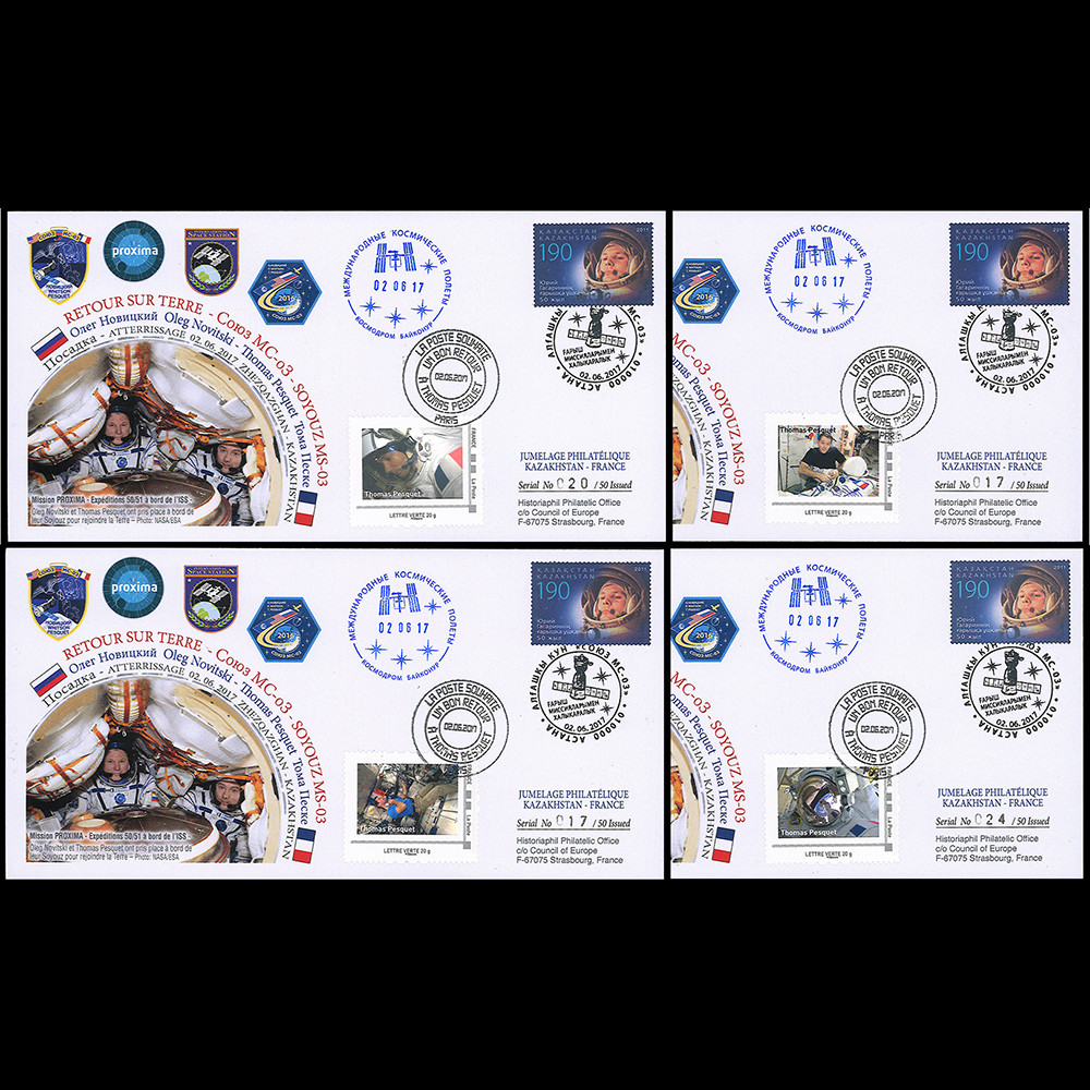 Une série de quatre plis astrophilatéliques exceptionnels, réalisés en jumelages philatéliques «Kazakhstan - France», commémore ce moment historique de la conquète spatiale européenne. Attention! Seules 50 séries numérotées ont été réalisées.
