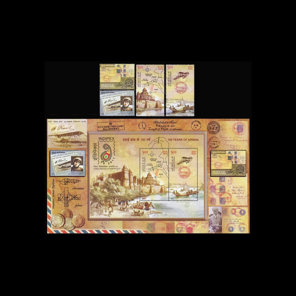 N°A380-122-123N : INDE 4 valeurs + 1 bloc-feuillet de 4 valeurs "INDIPEX 2011 - Henri Péquet - 100 Years of Airmail (Centenaire de la Poste Aérienne)"