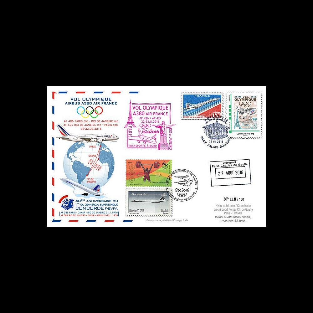 Des timbres-poste personnalisés, cachets et plis spéciaux franco-brésiliens ont été spécialement conçus par le studio graphique d’Historiaphil pour commémorer le “Vol Olympique Paris-Rio 2016“ et les “40 ans du premier vol commercial supersonique de Concorde“ effectué en 1976 sur cette même ligne. Un tirage limité de 240 documents aérophilatéliques a pu être transporté à bord, avec l’aimable participation du personnel navigant d’Air France qui a opéré le “Vol Olympique“.
