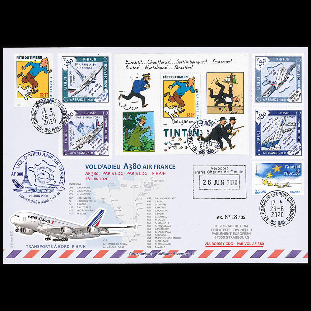 C'est avec l'aimable participation de membres du personnel navigant d'Air France, que les éditions Historiaphil ont réalisé en un temps record une collection hommage d'enveloppes aérophilatéliques à tirages limités, transportées à bord du "Vol d'adieu AF 380" du 26 juin 2020.