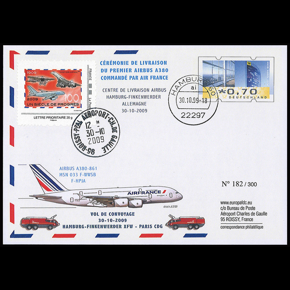 Type 1 Enveloppe PAP Allemagne prêt à poster "70c Post Tower Bonn" ft. C6 oblit. tàd Hamburg 30.10.2009+ TPP France Lettre 20g rouge “1909-2009 Un Siècle de Progrès - Blériot - Concorde - Airbus A380"oblit. tàd Roissy Ppal “Aéroport Ch. de Gaulle“ 30.10.2009