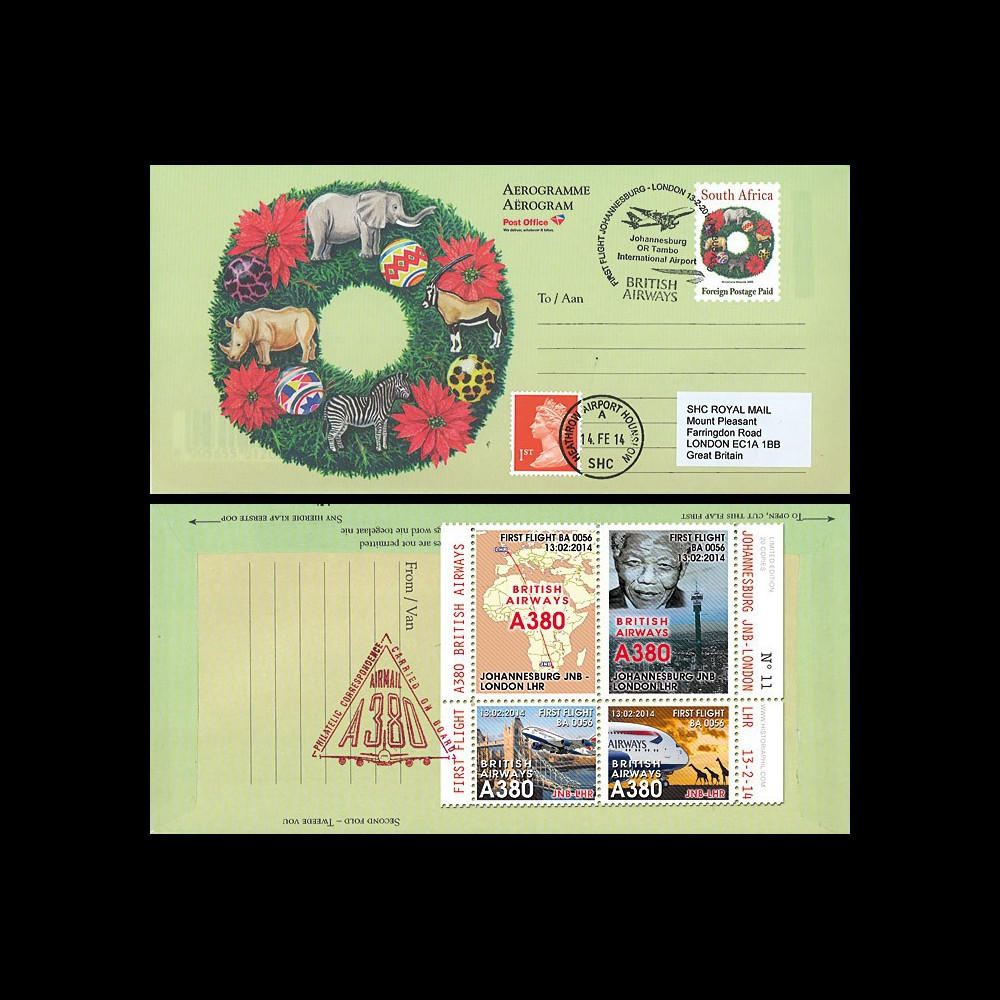 A380-247T2 : First Flight Cover (FFC, Aerogramme) AFRIQUE DU SUD "13.02.2014 : 1er vol Airbus A380 British Airways Johannesburg JNB (Afrique du Sud) - Londres LHR"