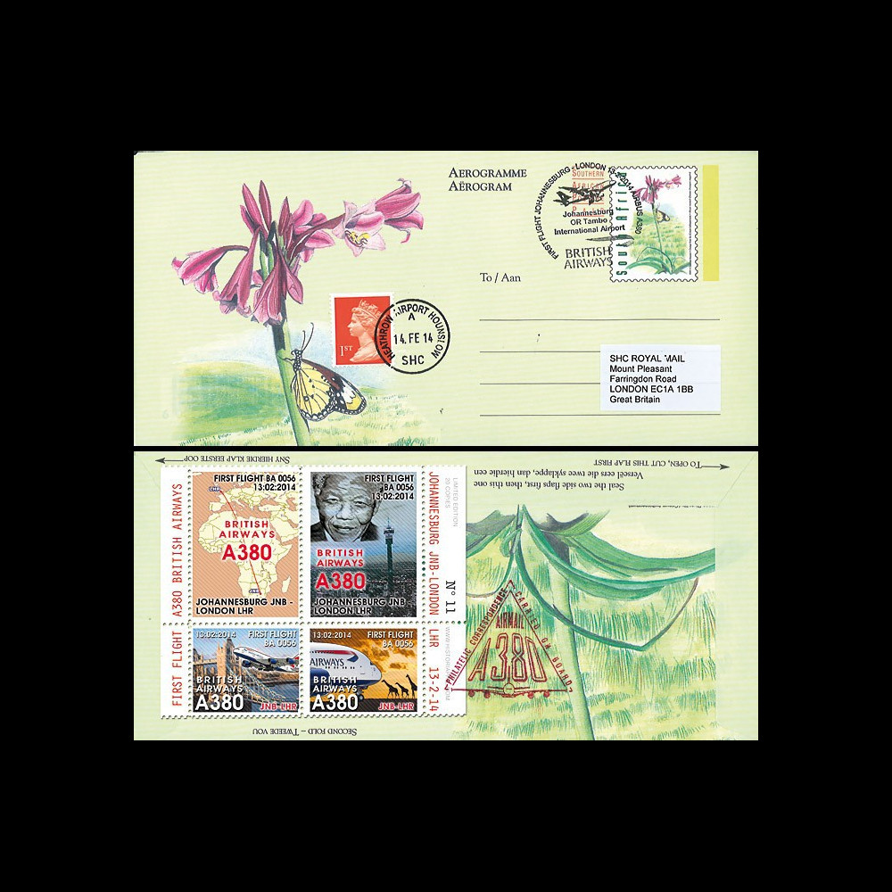 A380-247T3 : First Flight Cover (FFC, Aerogramme) AFRIQUE DU SUD "13.02.2014 : 1er vol Airbus A380 British Airways Johannesburg JNB (Afrique du Sud) - Londres LHR"