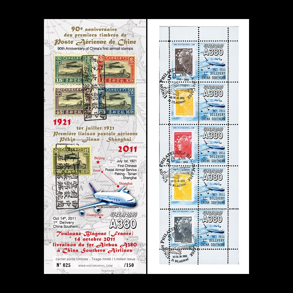 N°A380-154C : Carnet porte-timbres dentelé et gommé “Livraison du 1er Airbus A380 de China Southern Airlines et 90e anniversaire des Premiers timbres de Poste Aérienne de Chine 1921-2011“