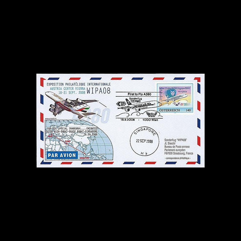 Vol spécial inaugural pour l'exposition philatélique internationale WIPA08 Wien, 18.09.2008 : 125 ans après la 1ère exposition philatélique mondiale, les portes de l'Austria Center Vienna (Autriche) se sont ouvertes sur l'exposition internationale WIPA08. A cette occasion, un vol spécial inaugural 'EK 128 Wien - Dubaï / EK 432 Dubaï - Singapore' sur Emirates a transporté du courrier aérophilatélique. Les Postes autrichiennes ont émis un timbre 'Poste aérienne' personnalisé WIPA08 sur le thème de l'Airbus A380. Une oblitération spéciale 'First to Fly A380 - Sonderflug WIPA08 Wien' authentifie le transport du courrier à bord de ce vol.