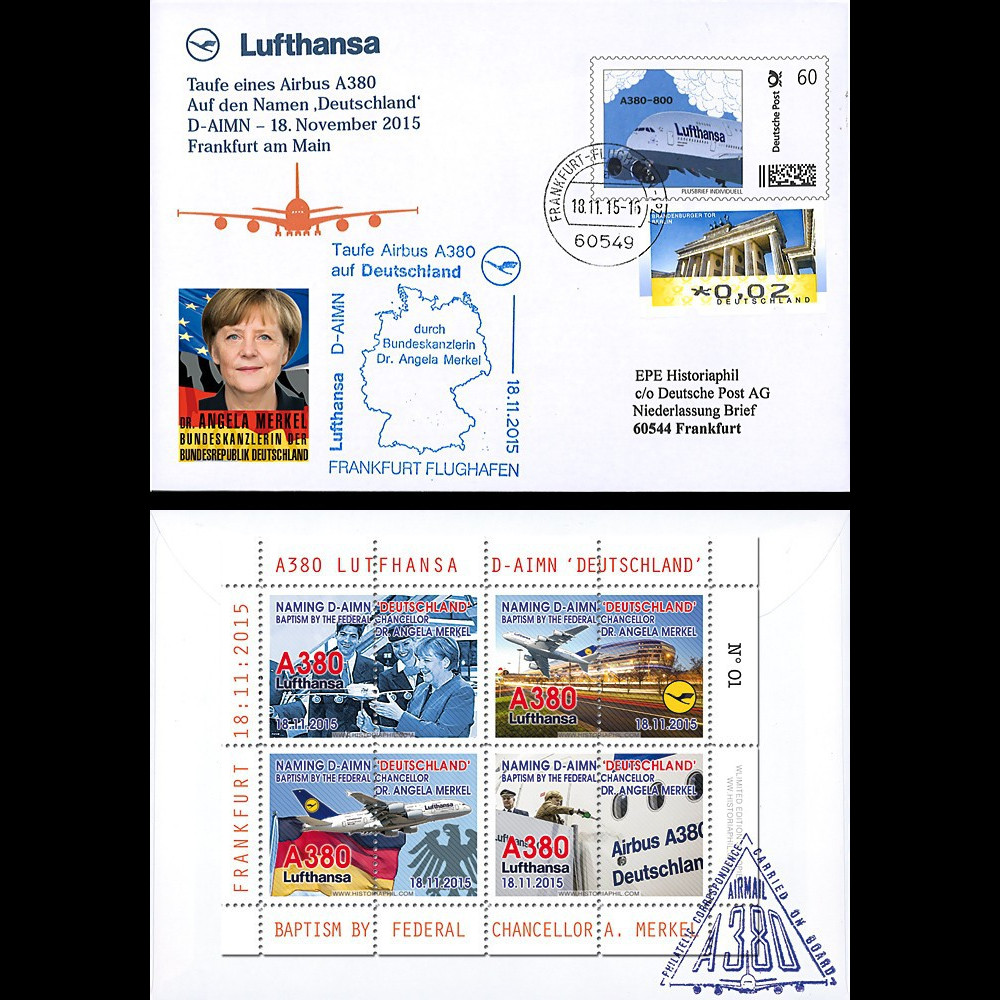 A380-DEUTSCH : Allemagne pli commémoratif “Baptême de l’A380 D-AIMN Lufthansa ‘Deutschland’ par la chancellière Angela Merkel 15.11.2015“