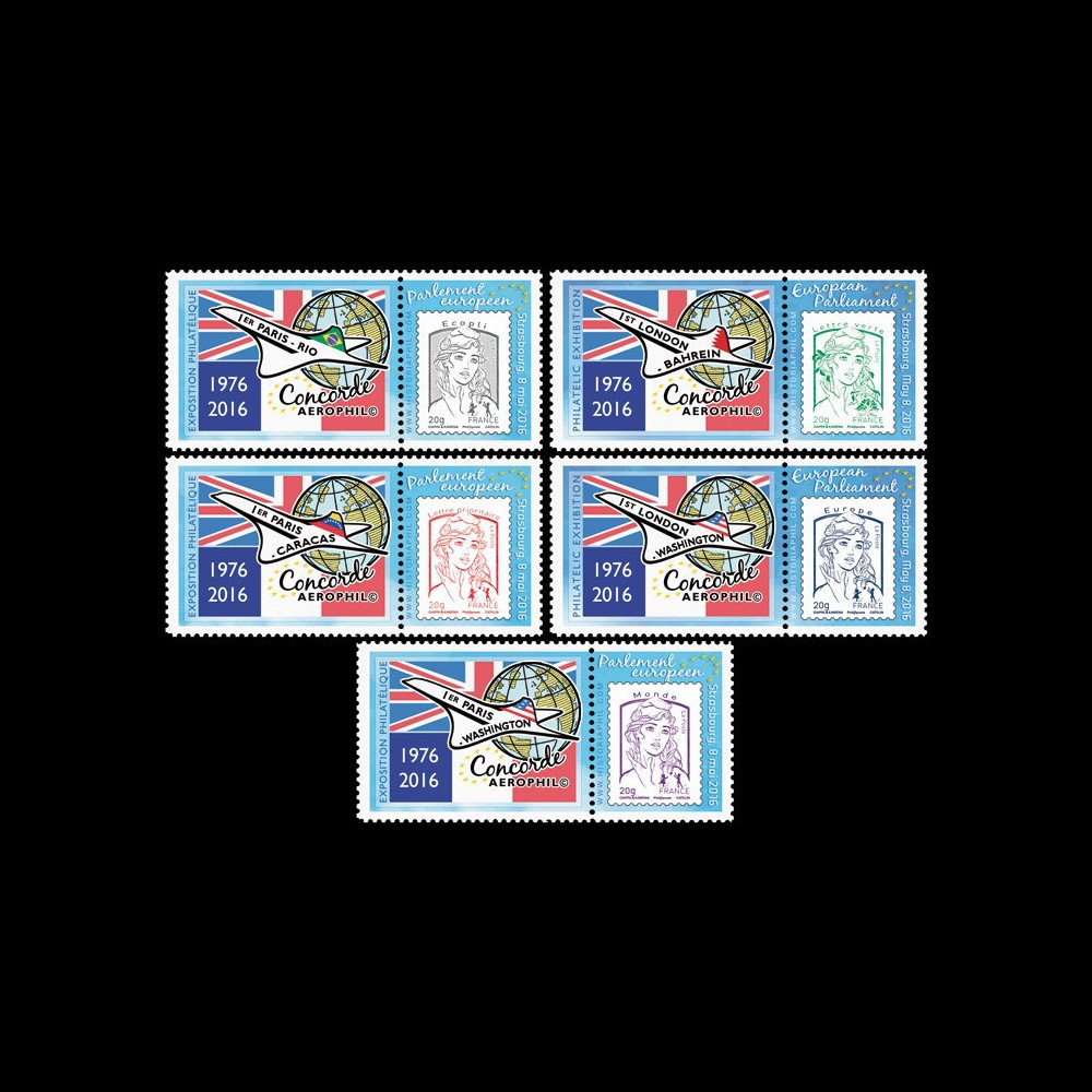 CO-RET67PT1/5 : série 5 porte-timbres privés “40 ans des premiers vols commerciaux du supersonique CONCORDE 1976-2016 / Parlement européen/ 1er Paris - Rio / 1er Londres - Barhein / 1er Paris - Caracas / 1er Londres - Washington / 1er Paris - Washington“