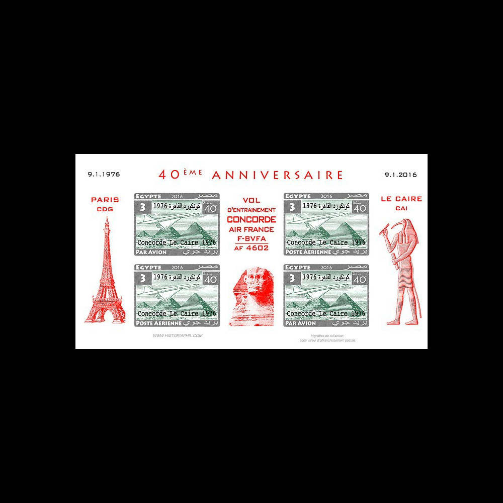 9.01.1976-2016 : Une série de 10 feuillets a été émise pour le 40e anniversaire du Premier Vol du CONCORDE F-BVFA AIR FRANCE Paris - Le Caire (Egypte) / Vol d’Entrainement AF 4602.