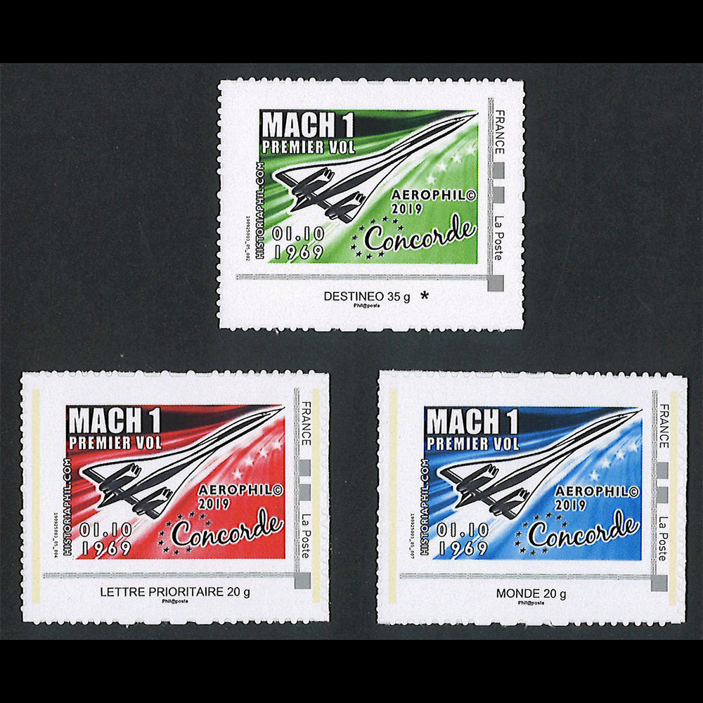 En commémoration des 50 ans du 1er vol de Concorde à MACH 1, les éditions Historiaphil ont conçu une série de trois timbres personnalisés émis le jour anniversaire du 1er octobre 2019, à l’occasion d’une exposition philatélique organisée au Conseil de l’Europe (Strasbourg, France).Ces timbres furent utilisés sur des plis “Premier Jour“ transportés à bord du1er vol de l’A350 Air France AF520 Paris - (Bamako)- Abidjan du 7 octobre 2019.
