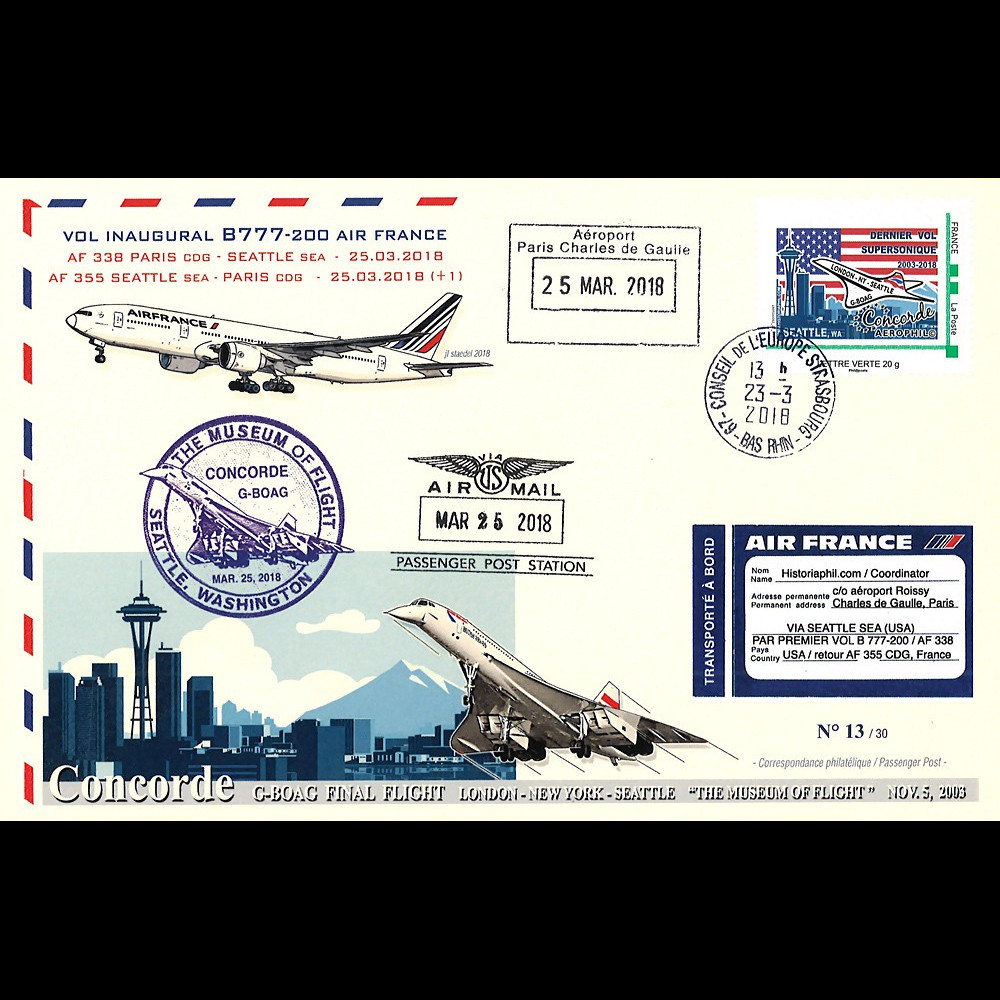 CO-RET81 : Maxi-FFC (20,8 x 13,5mm) transportée à bord du “vol inaugural B777-200 Air France AF 338 Paris - Seattle, 25.03.2018 / commémoration des 15 ans du dernier vol supersonique Concorde British Airways G-BOAG à Seattle 2003-2018“