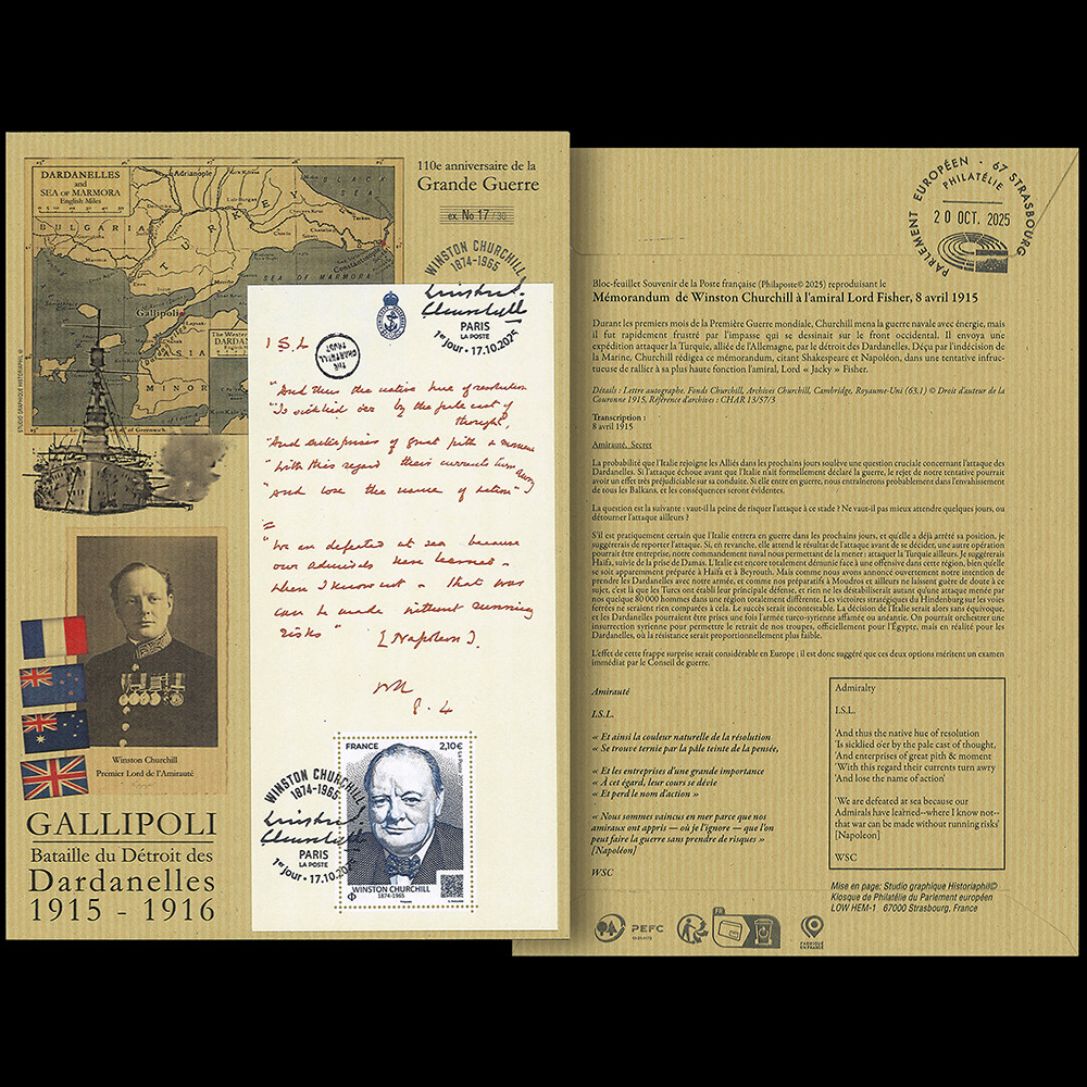 Bloc-feuillet Souvenir de la Poste française (Philaposte© 2025) reproduisant le Mémorandum de Winston Churchill à l'amiral Lord Fisher, 8 avril 1915