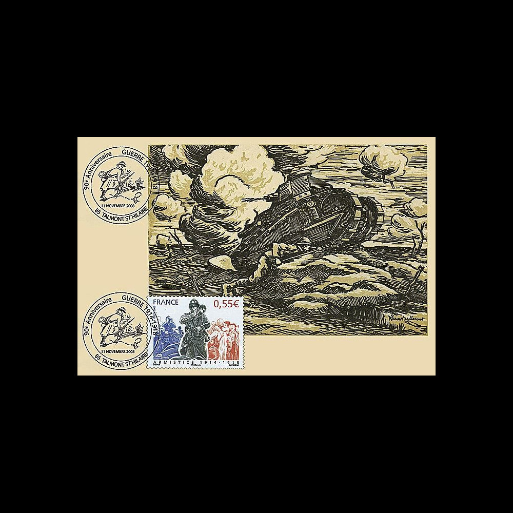 N°W1 08-11CP : Carte maximum "Char d'assaut Renault : une panne dans les lignes" Illustration : composition de Berne-Bellecourt, Gravure sur bois de Pidoll 0,55 EUR "Armistice 1918-2008"