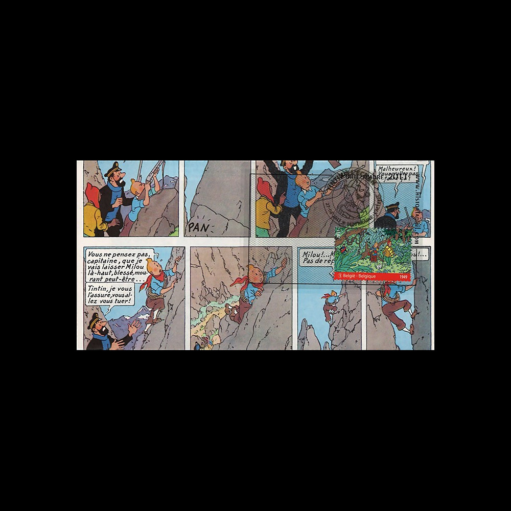 Comme nous l’avions déjà fait en 2001, pour l’émission commune entre le Congo et la Belgique d’un timbre et d’un bloc à l’occasion du 70ème anniversaire de l’album «Tintin au Congo» de 1931, mais également en 2007 pour la sortie d’un feuillet belge et de 6 timbres français «Centenaire de Hergé», père spirituel de Tintin, nous avons voulu créer une nouvelle fois un «1er jour» original et insolite, pour les tintinophiles et collectionneurs avertis. Pour cela, nous avons façonnées artisanalement des enveloppes à partir d’authentiques pages d’albums de Tintin correspondant aux timbres émis.