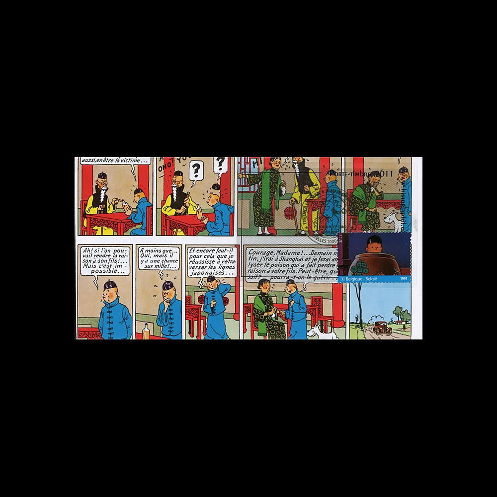 Pour les tintinophiles et collectionneurs passionnés, nous avons voulu créer un «1er jour» original. Pour cela, nous avons démonté plusieurs albums des aventures de Tintin pour en récupérer les pages. De ces pages nous avons façonné artisanalement des enveloppes à patte triangulaire.