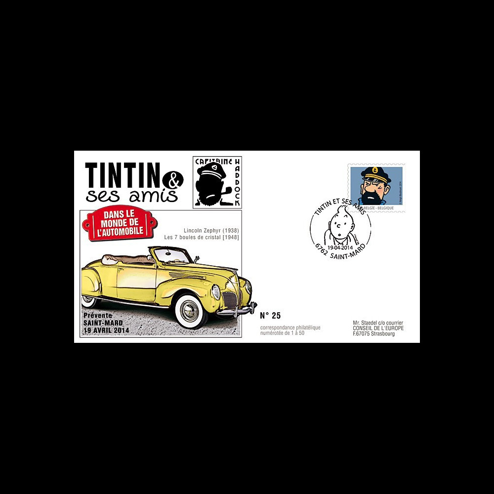 TIN14-8 : Belgique, FDC "COLLECTOR" Premier Jour "Tintin et ses amis dans le monde de l'automobile : Le Capitaine Haddock / Lincoln Zephyr (1938) / Les 7 Boules de Cristal (1948)".