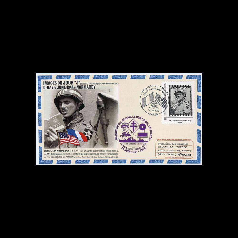 Cette série conçue par M. Jean-Luc Staedel à partir de photos d'archives "Conseil Régional de Basse-Normandie / National Archives USA", a été émise en "Premier Jour" le 14 juin 2012, jour du retour; il y a 68 ans, du Général de Gaulle sur le sol de France. C'est l'oblitération illustrée "Salon du Timbre - Amitié franco-américaine" qui a été choisie pour cela. C'est la seconde série d'une collection de timbres-poste personnalisés (IDtimbre© La Poste - France) qui seront réalisés chaque année, en hommage aux Libérateurs du D-Day.