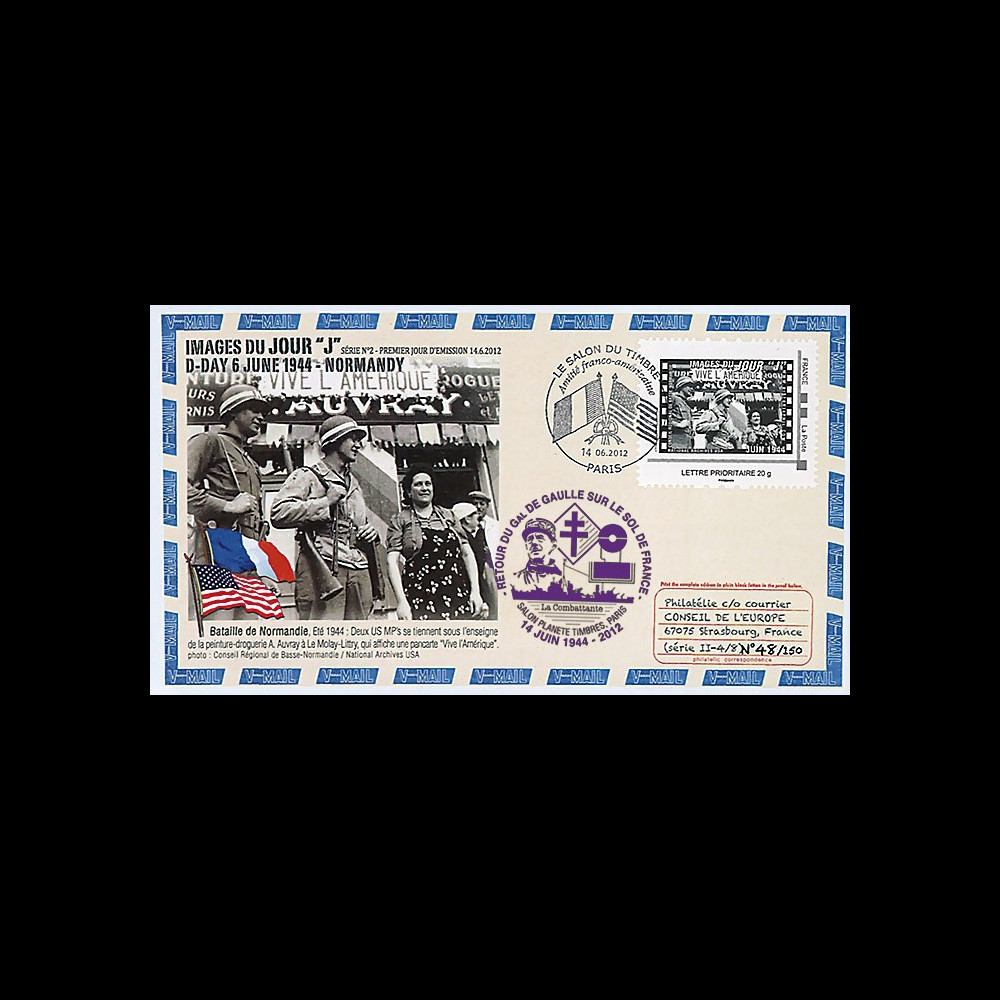Cette série conçue par M. Jean-Luc Staedel à partir de photos d'archives "Conseil Régional de Basse-Normandie / National Archives USA", a été émise en "Premier Jour" le 14 juin 2012, jour du retour; il y a 68 ans, du Général de Gaulle sur le sol de France. C'est l'oblitération illustrée "Salon du Timbre - Amitié franco-américaine" qui a été choisie pour cela. C'est la seconde série d'une collection de timbres-poste personnalisés (IDtimbre© La Poste - France) qui seront réalisés chaque année, en hommage aux Libérateurs du D-Day.