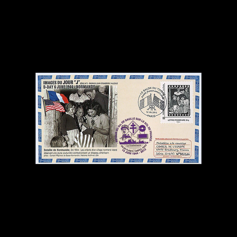 Cette série conçue par M. Jean-Luc Staedel à partir de photos d'archives "Conseil Régional de Basse-Normandie / National Archives USA", a été émise en "Premier Jour" le 14 juin 2012, jour du retour; il y a 68 ans, du Général de Gaulle sur le sol de France. C'est l'oblitération illustrée "Salon du Timbre - Amitié franco-américaine" qui a été choisie pour cela. C'est la seconde série d'une collection de timbres-poste personnalisés (IDtimbre© La Poste - France) qui seront réalisés chaque année, en hommage aux Libérateurs du D-Day.