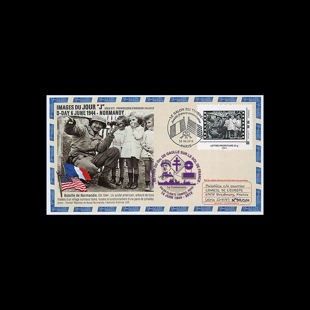 Cette série conçue par M. Jean-Luc Staedel à partir de photos d'archives "Conseil Régional de Basse-Normandie / National Archives USA", a été émise en "Premier Jour" le 14 juin 2012, jour du retour; il y a 68 ans, du Général de Gaulle sur le sol de France. C'est l'oblitération illustrée "Salon du Timbre - Amitié franco-américaine" qui a été choisie pour cela. C'est la seconde série d'une collection de timbres-poste personnalisés (IDtimbre© La Poste - France) qui seront réalisés chaque année, en hommage aux Libérateurs du D-Day.