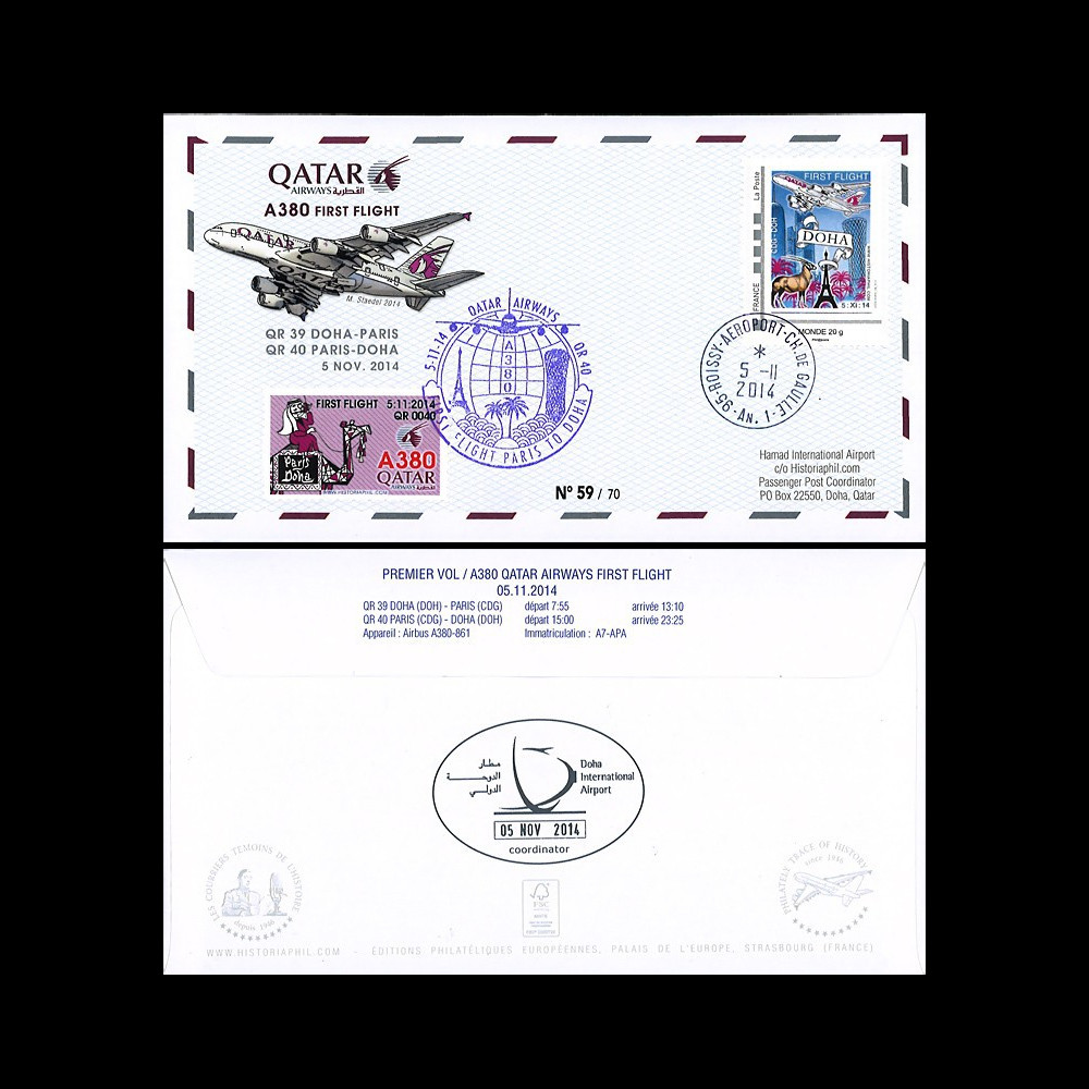 Une collection de timbres-poste personnalisés, vignettes gommées et plis aérophilatéliques à tirage limité portant les cachets de vol, avait été réalisée spécialement pour ce “Vol inaugural A380 Paris - Doha“de Qatar Airways.