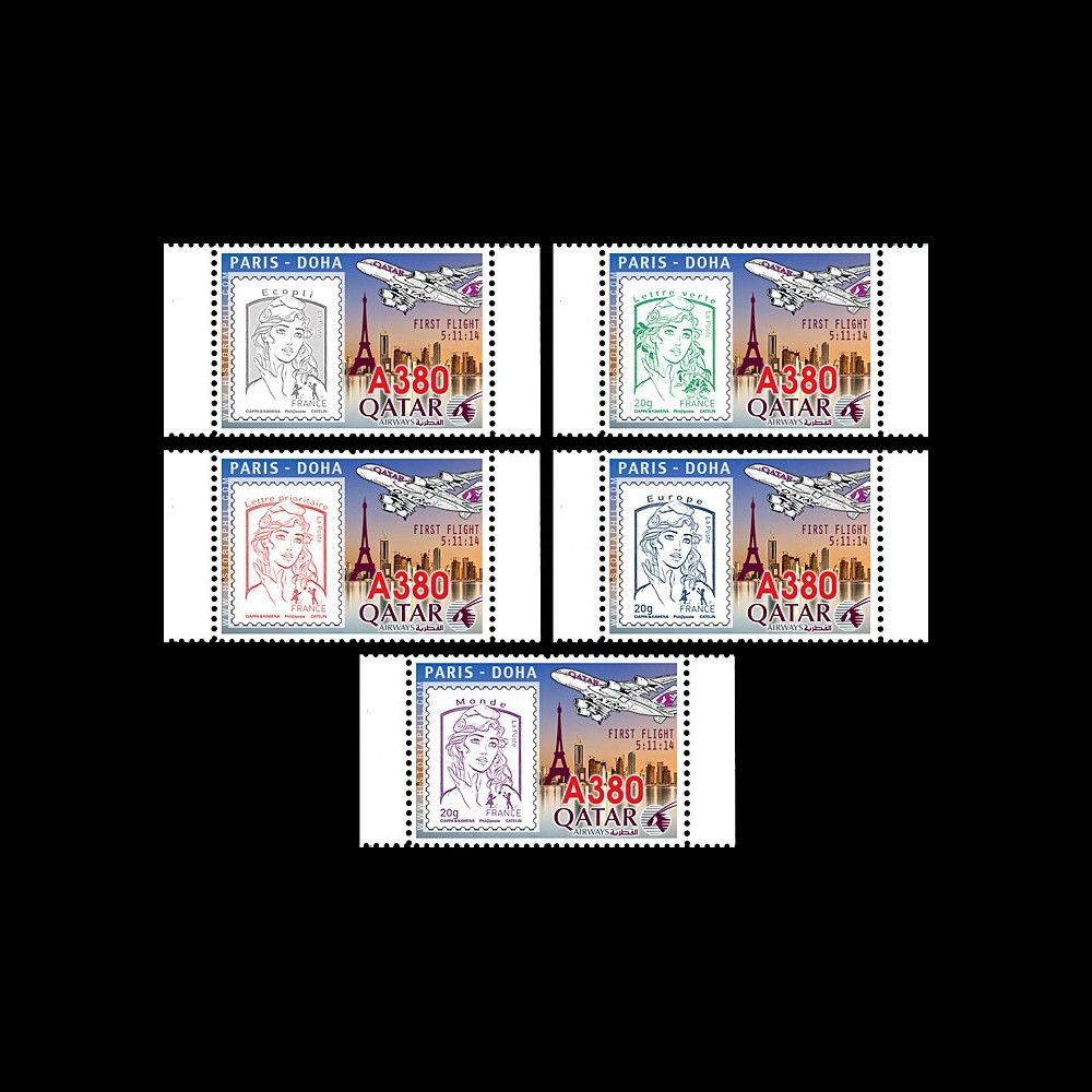 A380-286PT1/5 : série de 5 porte-timbres dentelés et gommés “Vol inaugural A380 Qatar Airways QR 40 Paris CDG - Doha DOH 5.11.2014“