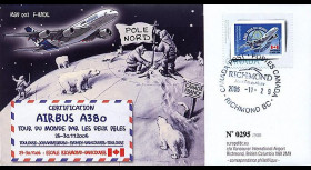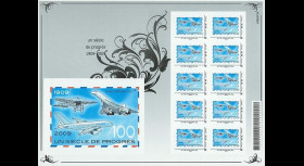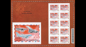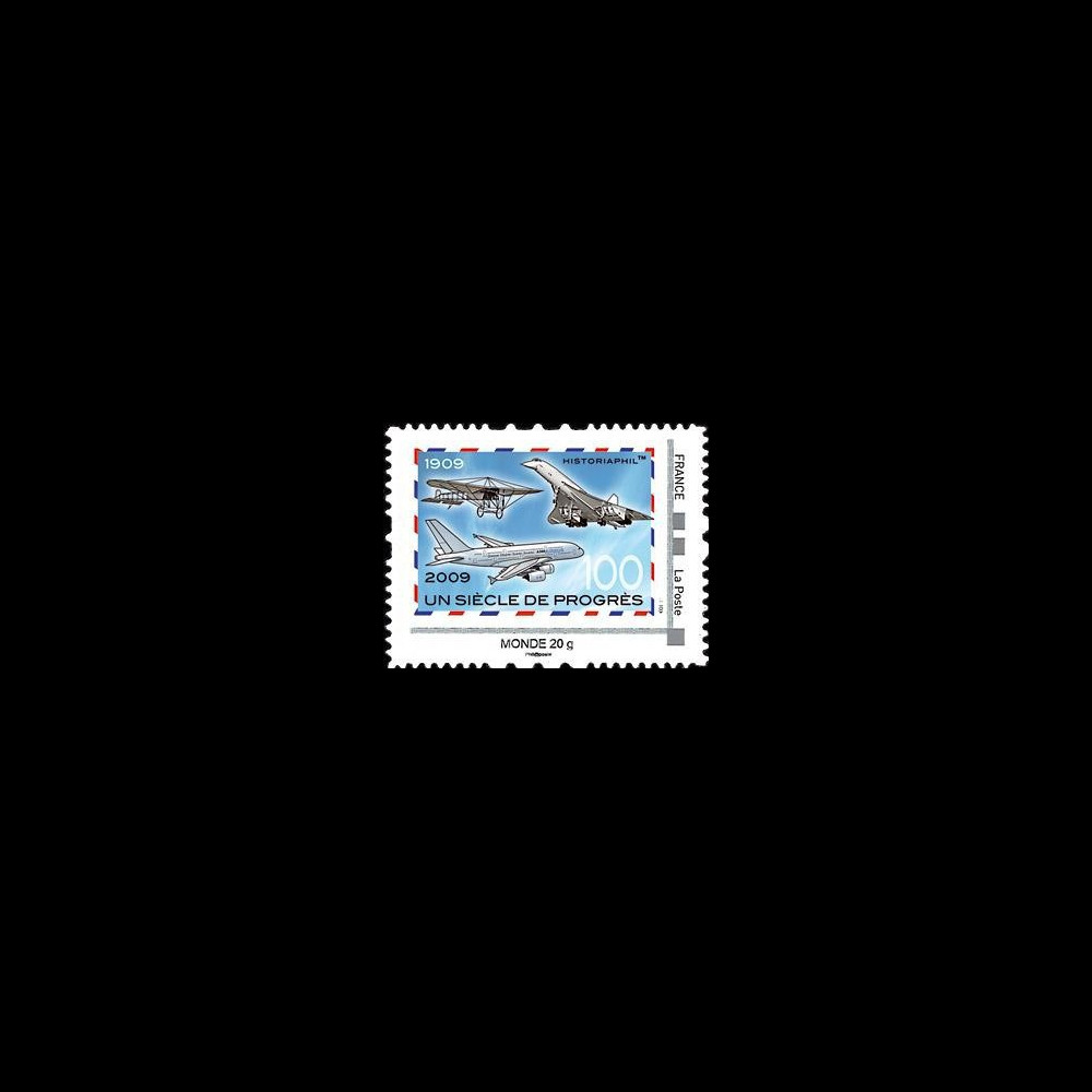N°A380-85N2M : Timbres personnalisés FRANCE Avions Blériot, Concorde et A380 '1909-2009 Un Siècle de Progrès' 1 valeur MonTimbraMoi 'Monde 20g' bleu / cadre gris (format 35mm x 46mm)