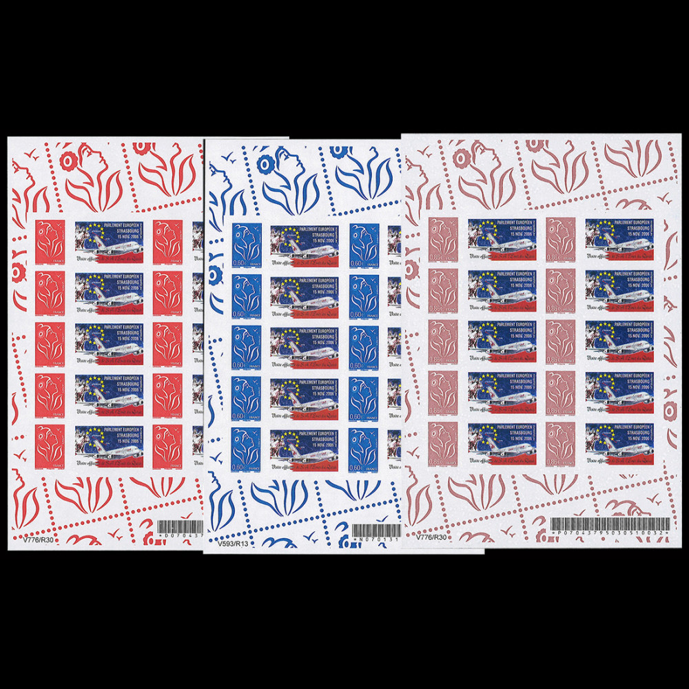N°PE528N1-3F (A380-26N1-3F) : 2006 FRANCE - Série de 3 feuillets de 10 valeurs Timbres-poste personnalisés (TPP) "Marianne de Lamouche - Parlement européen, Strasbourg 15.11.2006 : Visite officielle et discours de Son Altesse le Cheikh Hamad BEN KHALIFA AL THANI, Émir de l'État du Qatar / Airbus A380 Qatar Airways" :