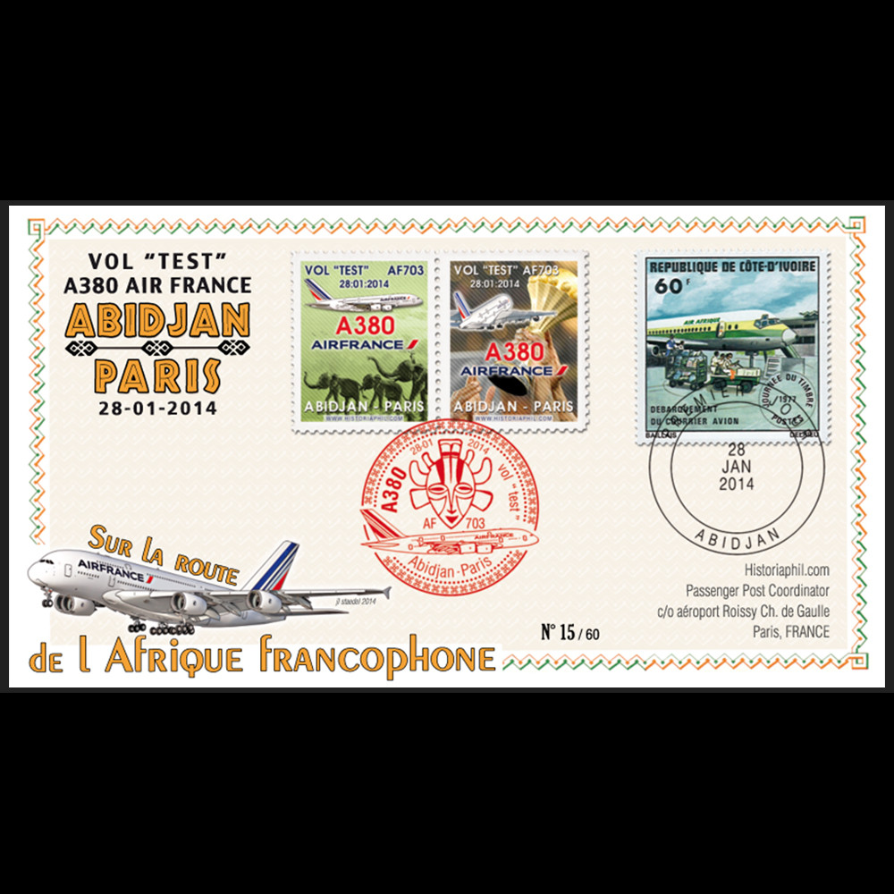 A380-252T1 : Pli spécial “à bord VOL TEST Airbus A380 AIR FRANCE AF703 Abidjan - Paris 28.01.2014“