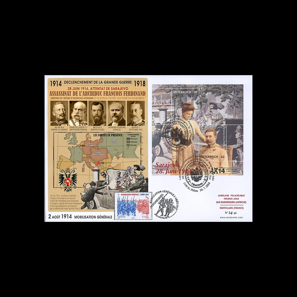 N°CENT14-3 : Maxi FDC AUTRICHE - FRANCE "26.7.2014 : Premier Jour à St-Pölten (Autriche) - 49e Régiment d'Infanterie du Baron von Hess - Centenaire Déclenchement Grande Guerre / Centenaire de l'Attentat de Sarajevo : Assassinat de l'Archiduc François Ferdinand, Héritier du Trône d'Autriche-Hongrie et de Sophie Chotek, Duchesse de Hohenberg / 02.08.2014 : Premier Jour à Morvillars (France) - Centenaire de la Mobilisation Générale des Troupes françaises / Empereur Wilhelm II d'Allemagne - Empereur François Joseph 1er d'Autriche - Empereur Nicolas II de Russie - Raymond Poincaré, Président de France - George V, Roi du Royaume-Uni / 1914-2014 : Centenaire Grande Guerre" (ft. 16,2 x 22,9 cm) 2014 :