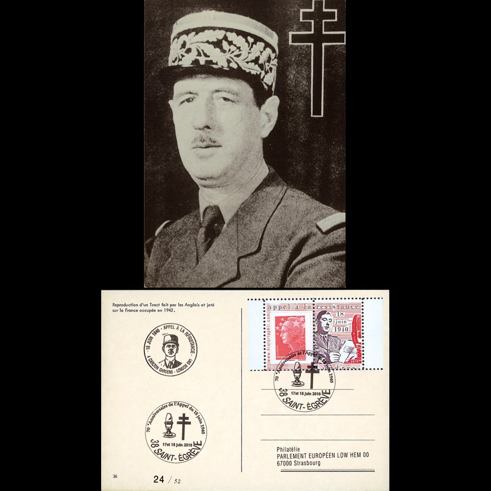 oblit. St Egrève “70e anniversaire de l’Appel du 18 juin 1940” 18.6.10