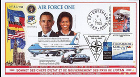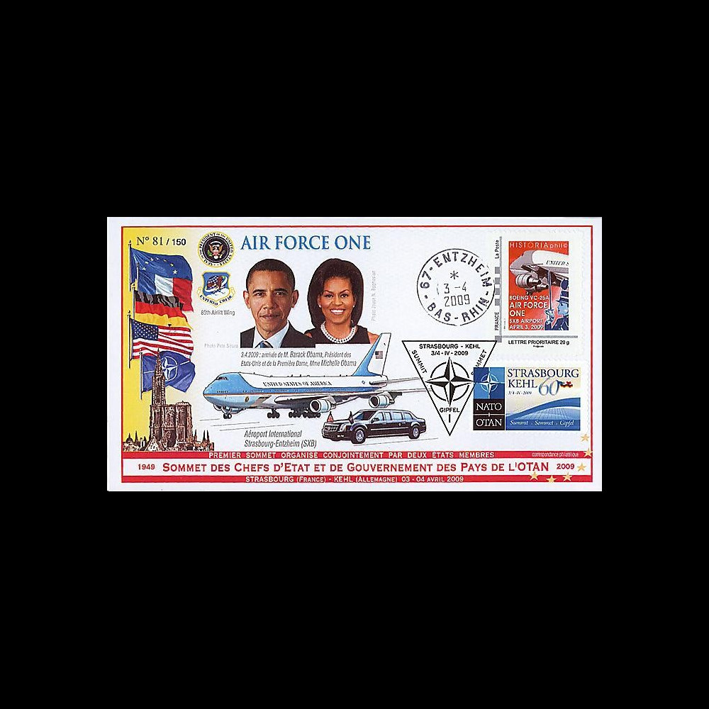 N°OTAN09-3 : FDC FRANCE "03.04.2009 : Arrivée de M. Barack OBAMA, Président des Etats-Unis et de Mme Michelle OBAMA, Première Dame des Etats-Unis à bord de l'Avion Présidentiel AIR FORCE ONE à l'aéroport Strasbourg-Entzheim SXB (France) / 3-4 avril 2009 : 60e Sommet de l'OTAN Strasbourg (France) - Kehl (Allemagne)" :