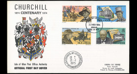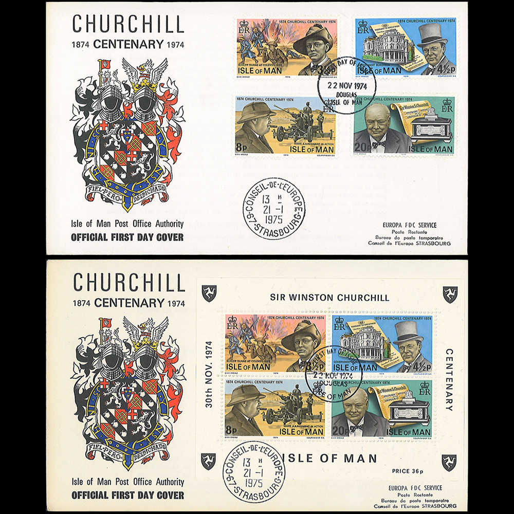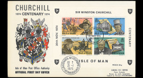 N°CHUR74-MANS : ISLE OF MAN (GB) 1974 - 2 FDC 4 val. + BLOC “Centenaire de la naissance de W. Churchill, Premier Ministre et Premier Lord de l’Amirauté (1874-1965)“