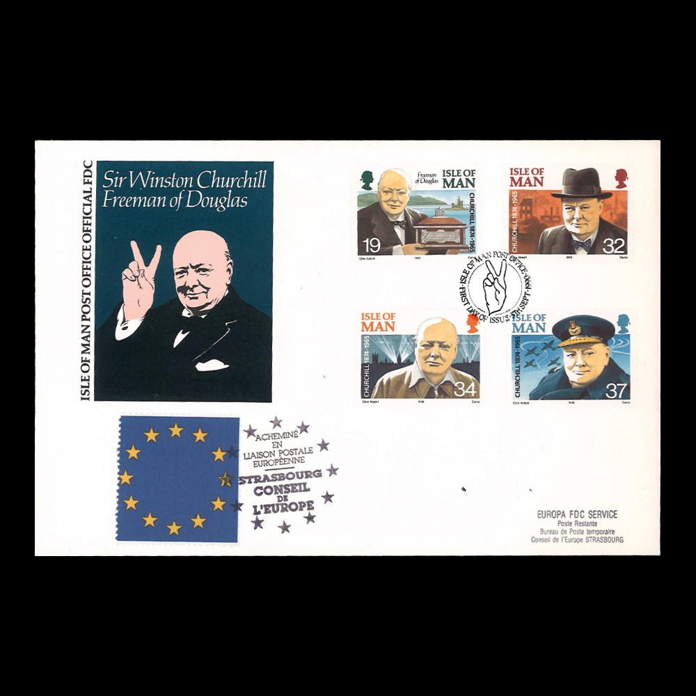 N°CHUR90-MAN : ISLE OF MAN (GB) 1990 - FDC 4 val. “25e anniversaire de la mort de Sir W. Churchill (1874-1965), Citoyen d’Honneur de la Ville de Douglas, Premier Ministre, Bataille d’Angleterre 1940“