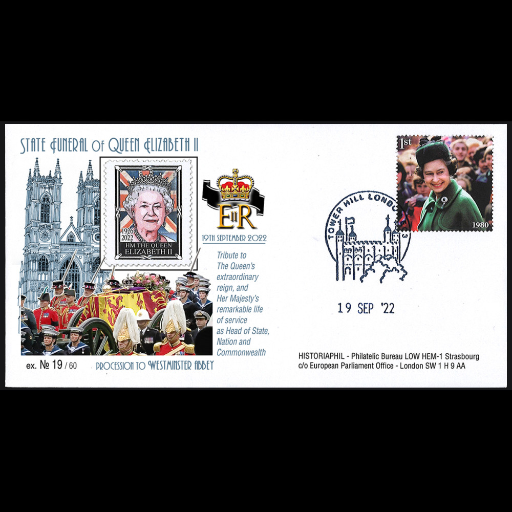 Le cercueil a quitté l'imposant catafalque sur lequel il était exposé au public jour et nuit depuis cinq jours, dans la plus vieille salle du parlement, Westminster Hall. Drapé de l'étendard royal et surmonté de la couronne impériale, porté par huit grenadiers de la Garde de la maison royale à la tunique rouge caractéristique, il a été déposé sur un affût de canon tiré au son des cornemuses et tambours par des marins de la Royal Navy, jusqu'à l'abbaye de Westminster où il arriva en procession, suivi à pied par le roi Charles III et la famille royale.