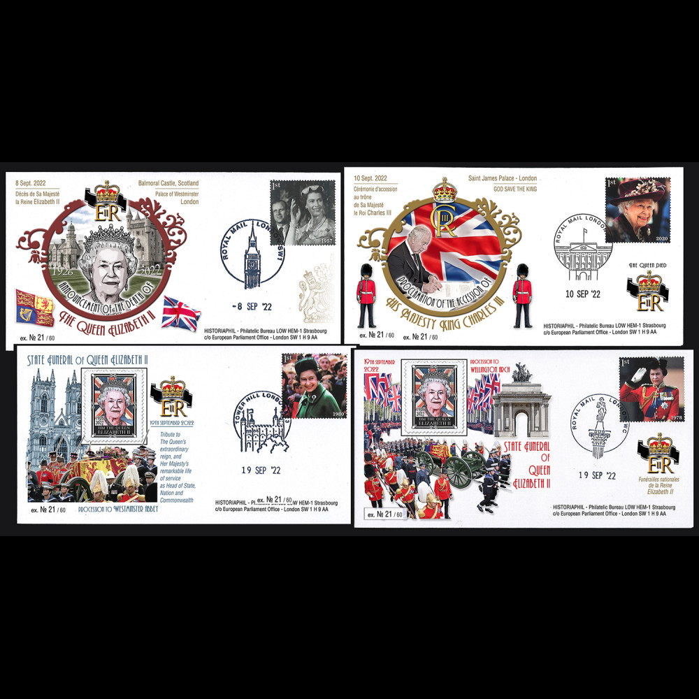 - Oblitérations London "Big Ben - House of Parliament - Palace of Westminster" 08 Sep. 2022, “Buckingham Palace" 10 Sep. 2022, "Tower Hill" 19 Sep. 2022 et "Admiral Nelson Column" 19 Sep. 2022