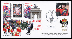 - timbre de deuil (vignette) "HM The Queen ELIZABETH II 1926-2022" + cachet d'arrivée "Philatélie - Parlement européen Strasbourg" (France) au verso