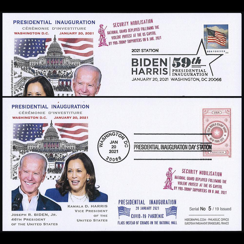 Deux oblitérations postales officielles “PRESIDENTIAL INAUGURATION DAY“ ont été mise en service le 20 janvier 2021 à Washington DC. Elles ont été apposées sur tous nos souvenirs philatéliques historiques, réalisés en tirages limités.