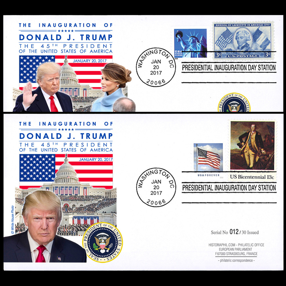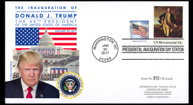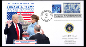 Une oblitération postale officielle “PRESIDENTIAL INAUGURATION DAY“ a été mise en service le 20 janvier 2017 à Washington DC. Elle a été apposées sur tous nos souvenirs philatéliques historiques, réalisés en tirages limités.