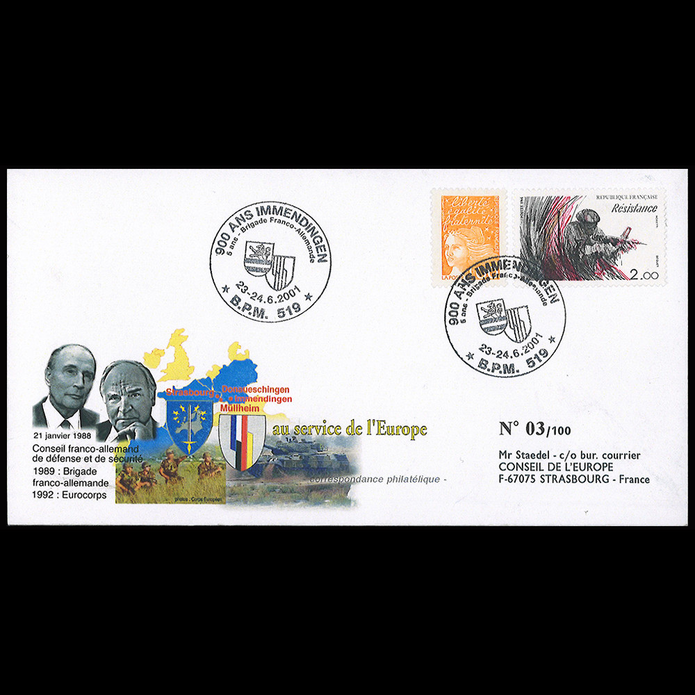 - Oblitération illustrée Immendingen BPM 519 (Bureau de Poste Militaire français en Allemagne) “5 ans Brigade Franco-allemande” 23-24.06.2001