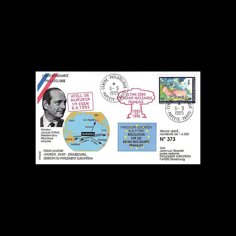 N°PE310 : FDC Papeete - Tahiti 6.9.1995 "Ultime série d'essais nucléaires français / 1er essai Atoll de Mururoa"