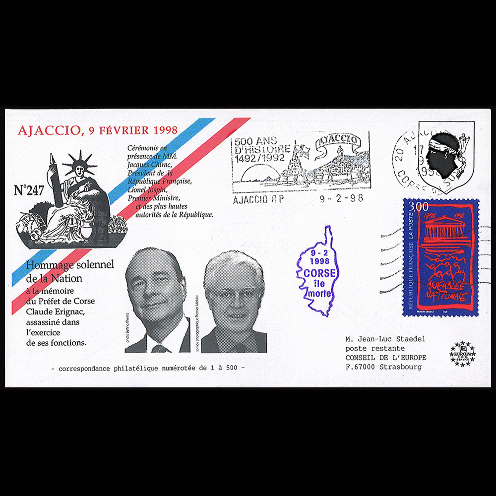 Au même titre que nos précédentes éditions réalisées en hommage au Préfet de la République Jean Moulin, assassiné en 1943, des enveloppes philatéliques historiques ont été réalisées en commémoration de la Cérémonie d’Hommage de la Nation au Préfet Claude Erignac.