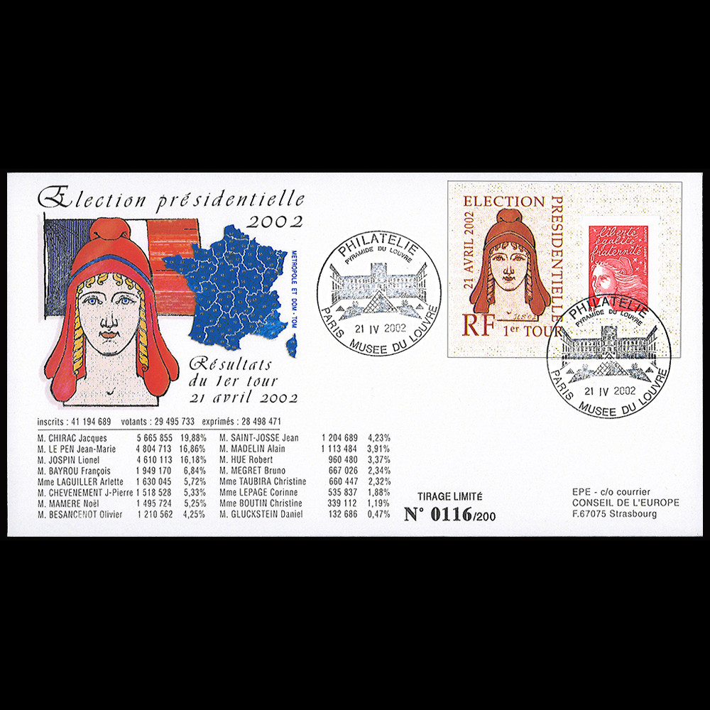 - Affranchissement TYPE 1 : France Lettre prioritaire 20g rouge "Marianne" sur Porte-timbre ND "1er TOUR Election Présidentielle : 21 avril 2002 - Marianne"