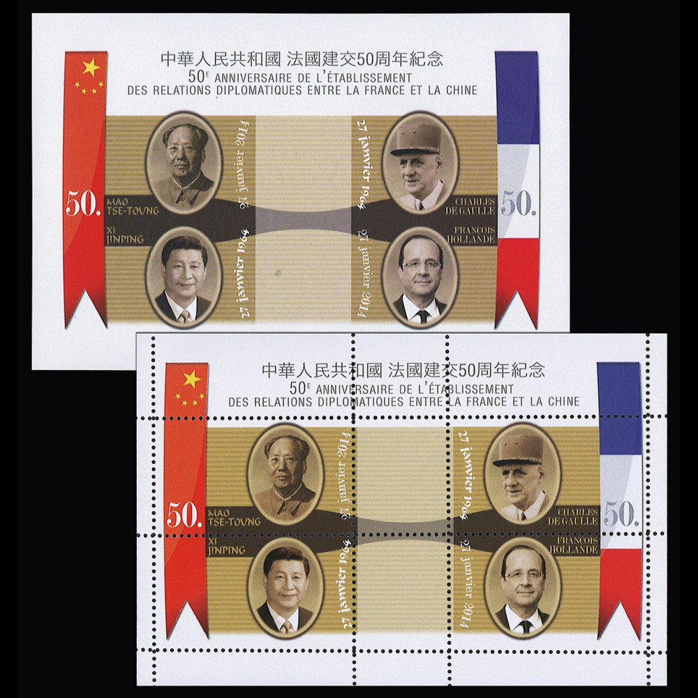 2 blocs de 4 vignettes sur papier gommé (Dentelé / Non-dentelé) MAO TSE-TOUNG et DE GAULLE (1964) - XI JINPING et F. HOLLANDE (2014)