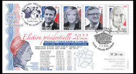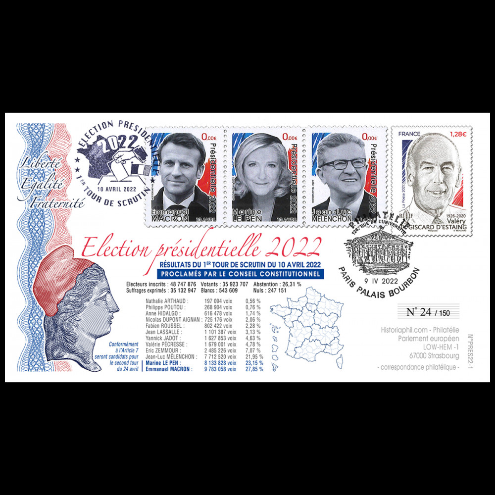 Oblitération (TYPE 1) GF Paris "Palais Bourbon“ (Assemblée Nationale) 09.04.2022 + cachet philatélique "Élection présidentielle 2022 - 1er tour de scrutin 10 avril 2022" + cachet arrivée "Parlement européen Strasbourg - Philatélie" au verso.