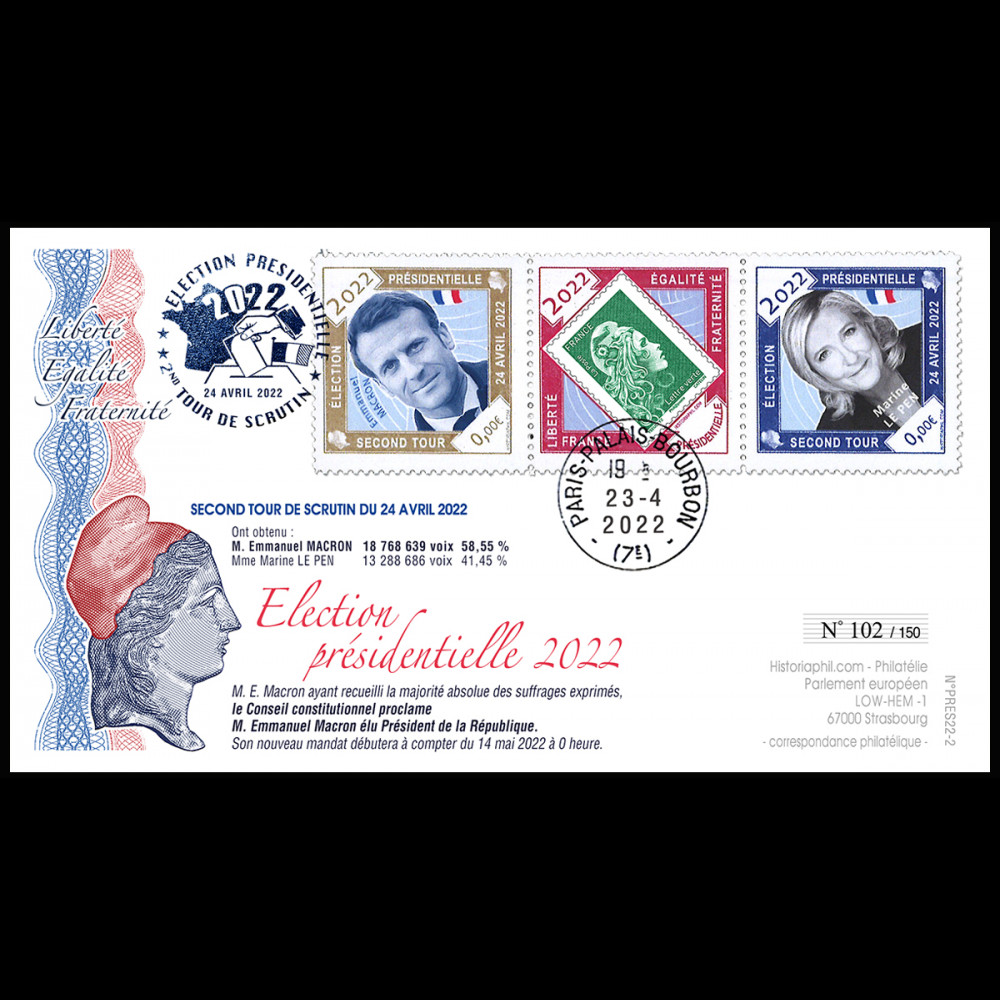 Oblitération (TYPE 2) tàd Paris "Palais Bourbon“ (Assemblée Nationale) 23.04.2022 + cachet philatélique "Élection présidentielle 2022 - 2nd tour de scrutin 24 avril 2022" + cachet arrivée "Parlement européen Strasbourg - Philatélie" au verso.