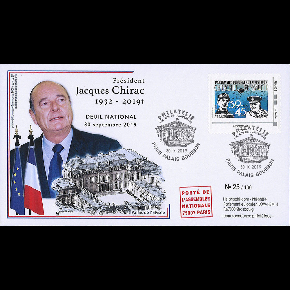 Une enveloppe philatélique historique a été éditée pour la Journée de deuil national en hommage au Président Jacques Chirac. Tirée à seulement 100 exemplaires numérotés, elle complète notre collection philatélique dédiée à la France et la construction européenne.