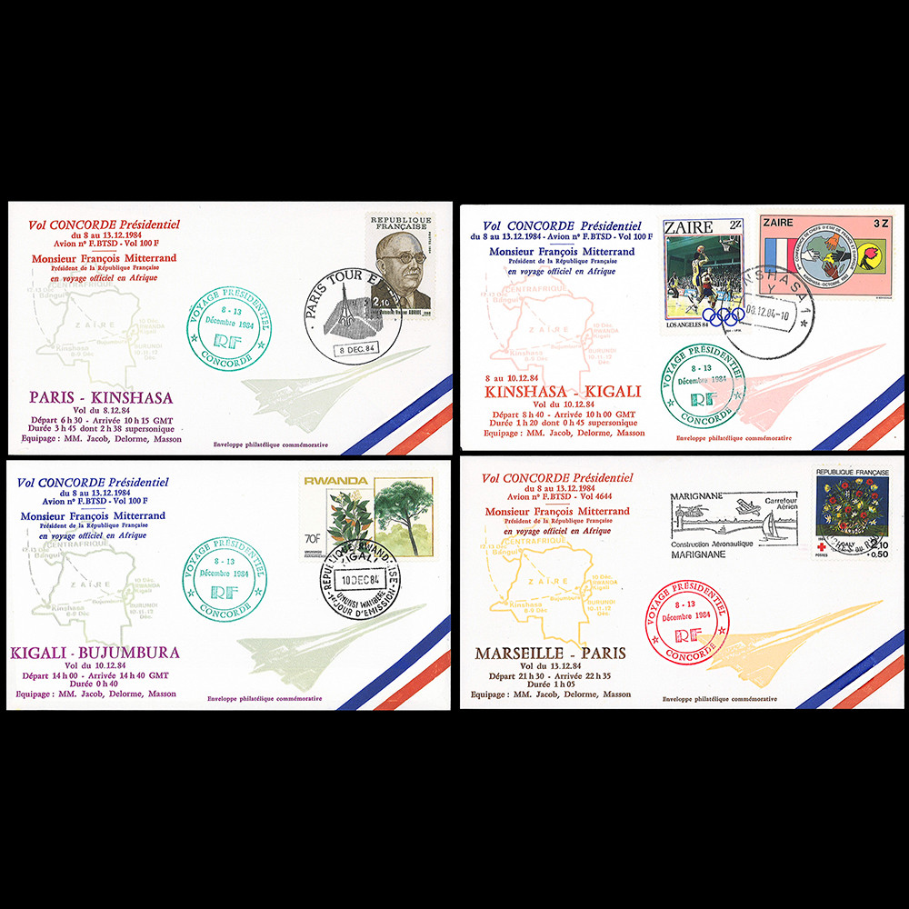 COAF84-12-8PR : 4 plis d’escale “Vol présidentiel Concorde 100F - Voyage officiel du Président Mitterrand en Afrique (Zaïre, Rwanda, Burundi) 8-13.12.1984“