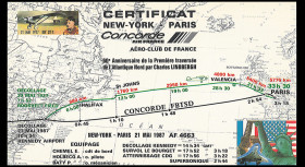 COAF87-5-21D : Pli transporté à bord “vol Concorde Air France AF 4663 New York - Paris - 60 ans traversée de l’Atlantique par Lindbergh, 21 mai 1927/1987“ - signé Commandant de Bord -