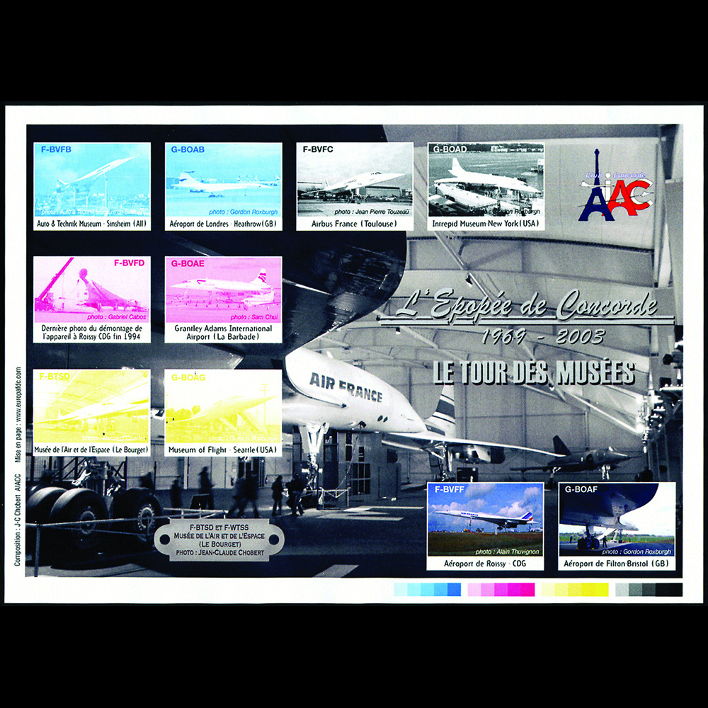 CO-E9E Vignettes ESSAI COULEURS "Epopée CONCORDE 1969-2003, Tour des Musées N°2"