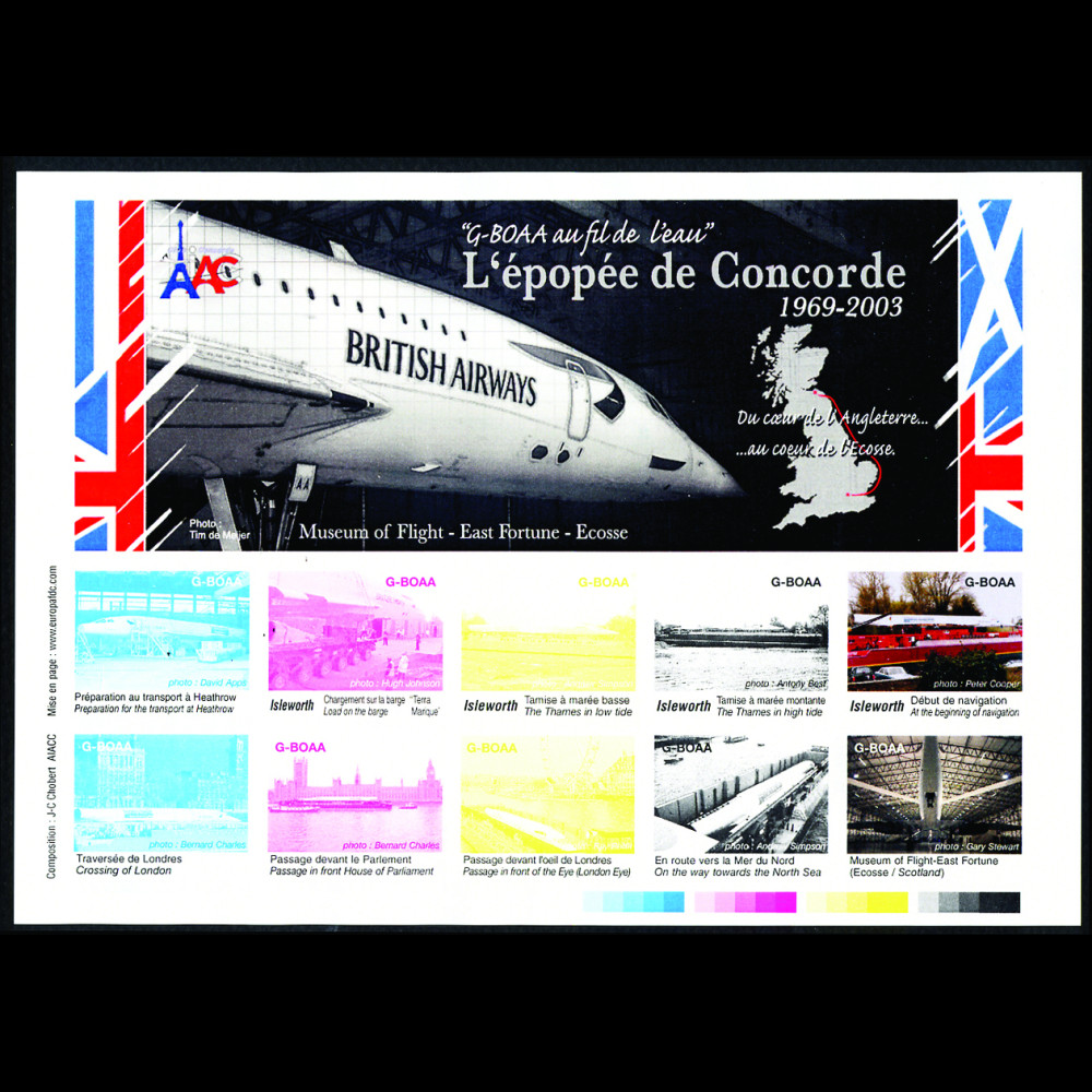 N°CO-E10E : Feuillet de 10 vignettes ESSAI DE COULEURS, gommées “L'Epopée de CONCORDE 1969-2003 - Concorde G-BOAA au fil de l'eau“ - Transfert de Concorde British Airways G-BOAA au Museum of Flight East Fortune (Ecosse)